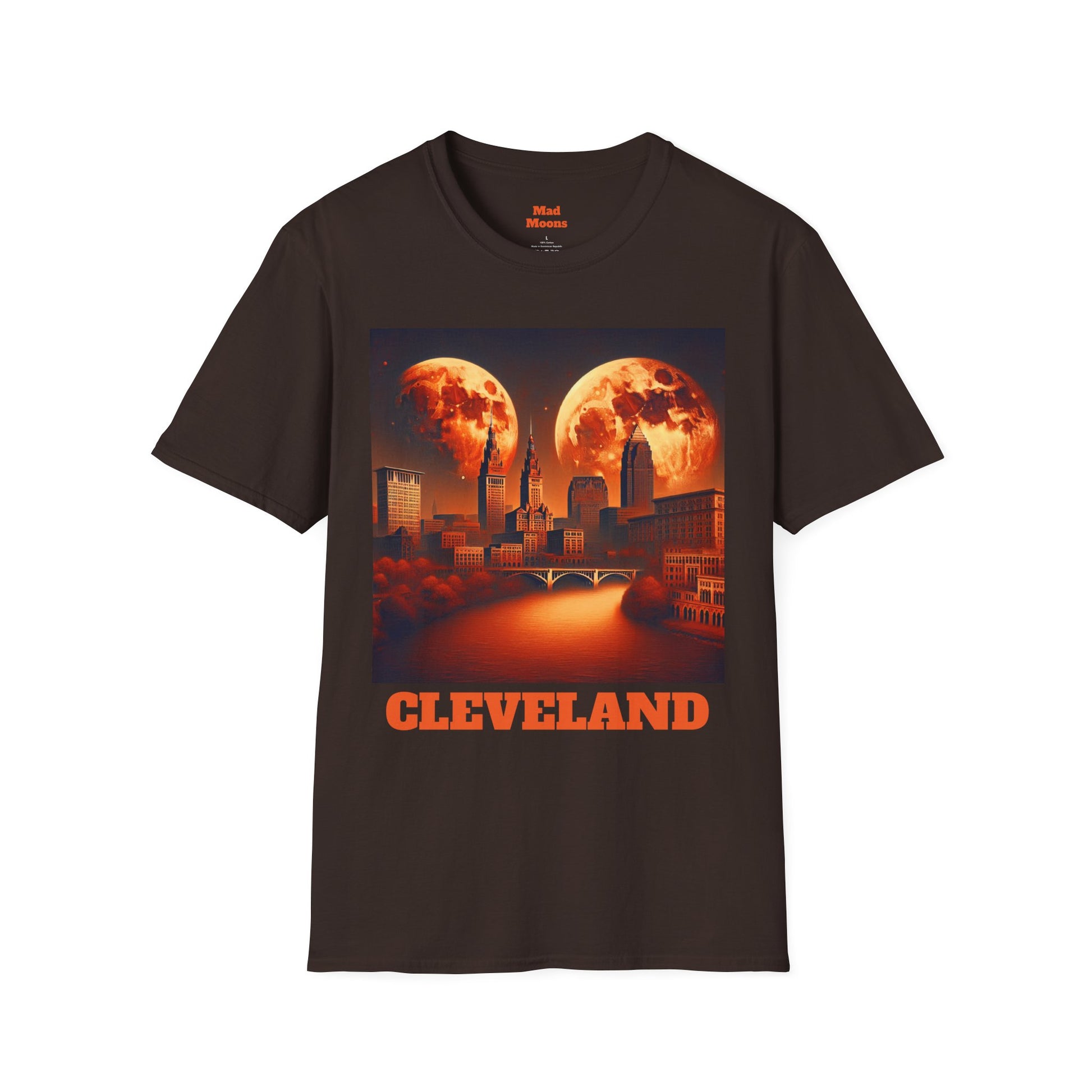 Cleveland underneath the Mad Moons. It is perfect for those who love Cleveland, rock and roll, football, orange skies, or astronomy-themed designs. Made using ethically grown and harvested US cotton. Lightweight, soft, and versatile, it can be worn all year round.